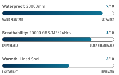 Gluga si manecile se uda cel mai adesea, sunt realizate din tesatura RipStop cu un plus rezistenta maxima la abraziune, oferind impermeabilitate si respirabilitate de 20k, materialul trunchiului este realizat dintr-o tesatura elastica ce ofera liberate de miscare. Insulatia este din Primaloft BIO, iar captuseala interioara din poliester elastic 100% din material reciclat.