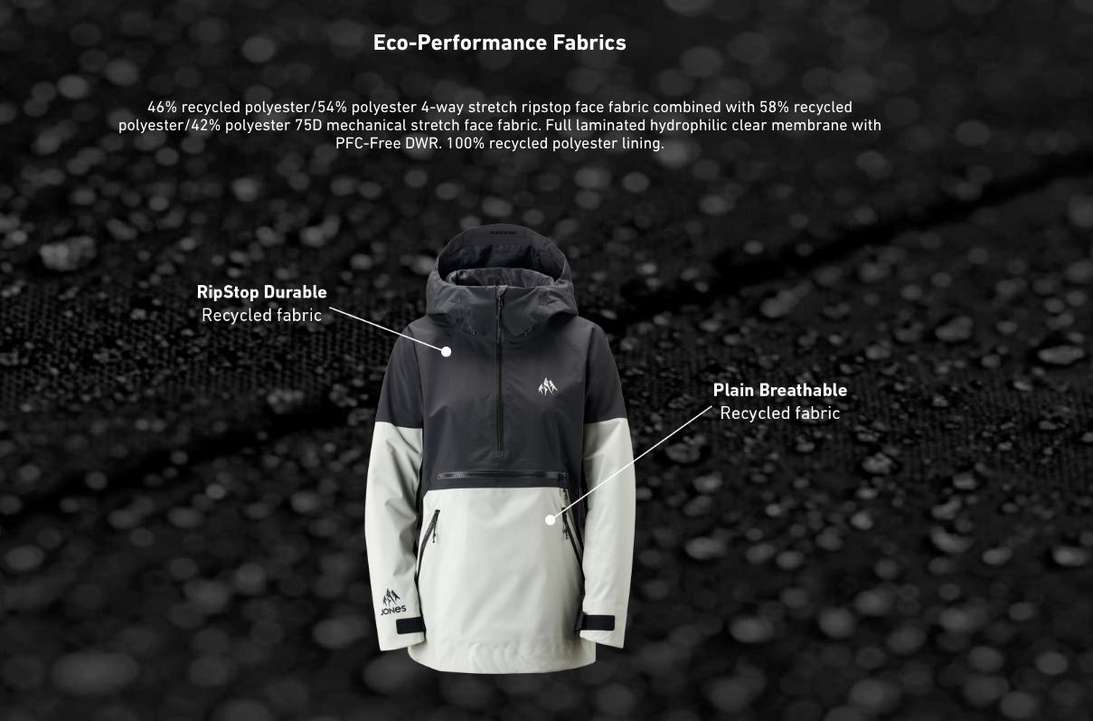 Tesaturi Eco-Performance 46% poliester reciclat 54% poliester tesatura frontala elastica x4 din RipStop si o tesatura dubla 75D. Membrana de impermeabilitate complet vulcanizata cu DWR fara PFC. Insulatia Primaloft 100% din material reciclat. Captuseala 100% din poliester reciclat.
